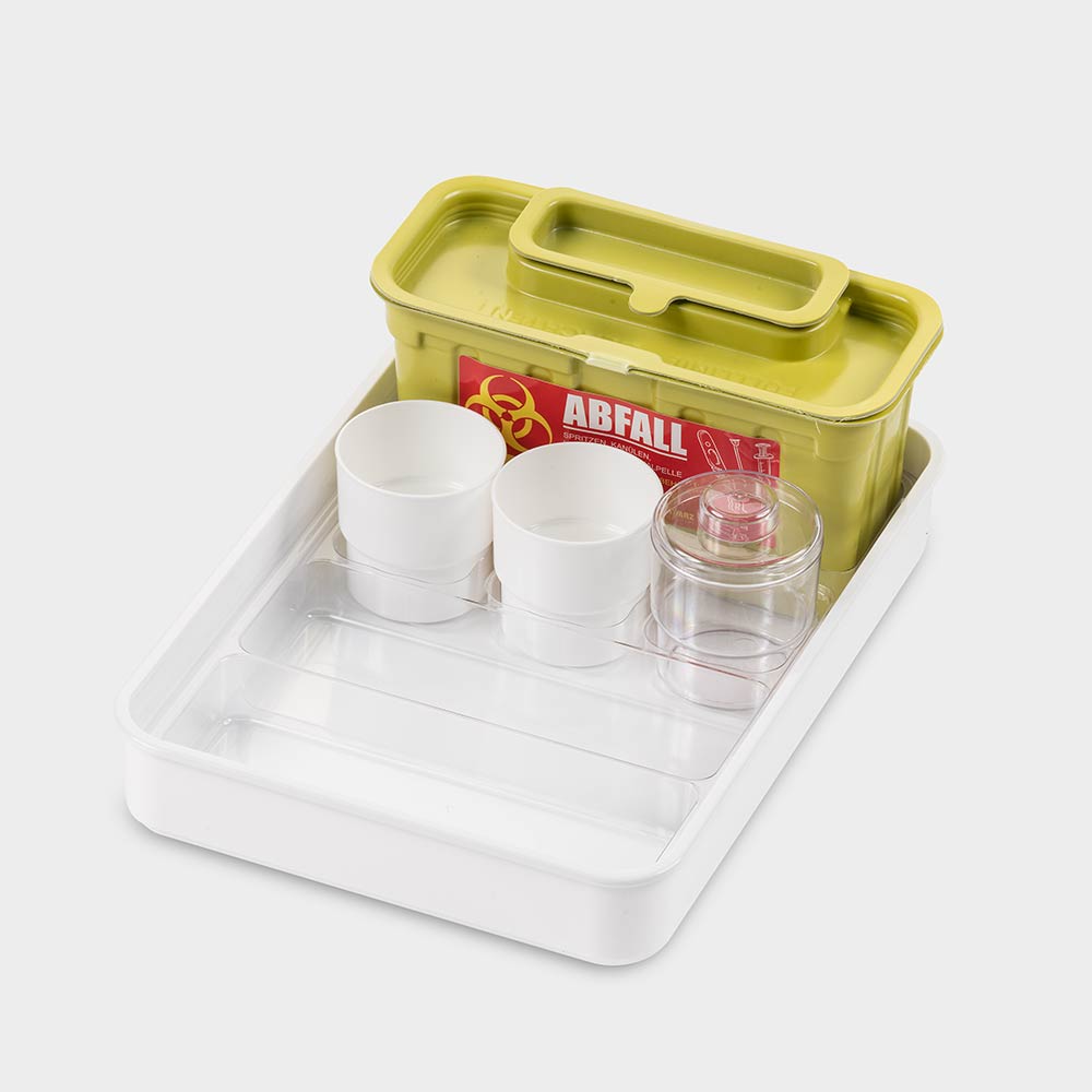 mit Tablett-Einsatz, 1 Kanülensammelbox, 2 Utensilienbecher rund und 1 Tupferbecher mit Deckel Außenmaße: L 353 x B 253 x H 55 mm