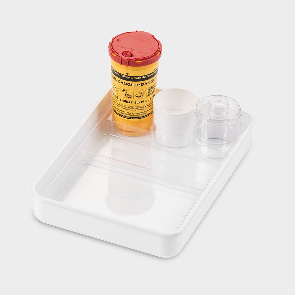 mit Tablett-Einsatz, 1 Kanülensammelbox, 1 Utensilienbecher rund und 1 Tupferbecher mit Deckel Außenmaße: L 353 x B 253 x H 55 mm